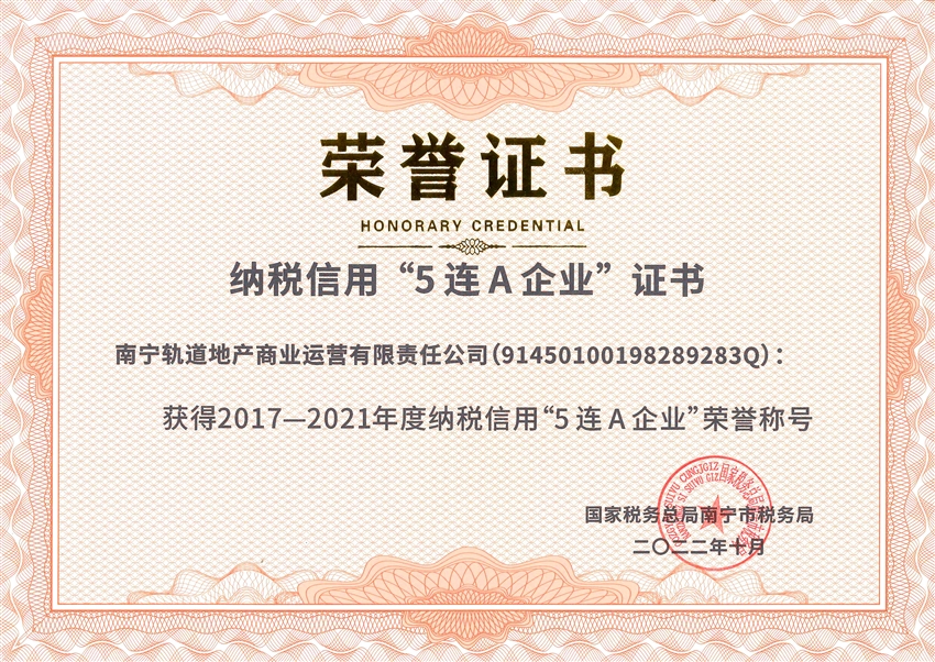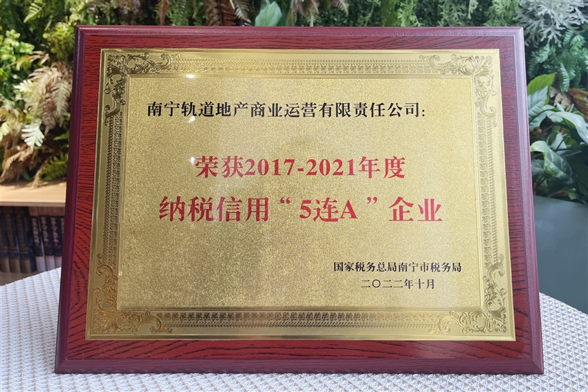【喜報】誠信納稅 守法經(jīng)營!軌道地產(chǎn)商業(yè)公司榮獲納稅信用“5連A”企業(yè)榮譽