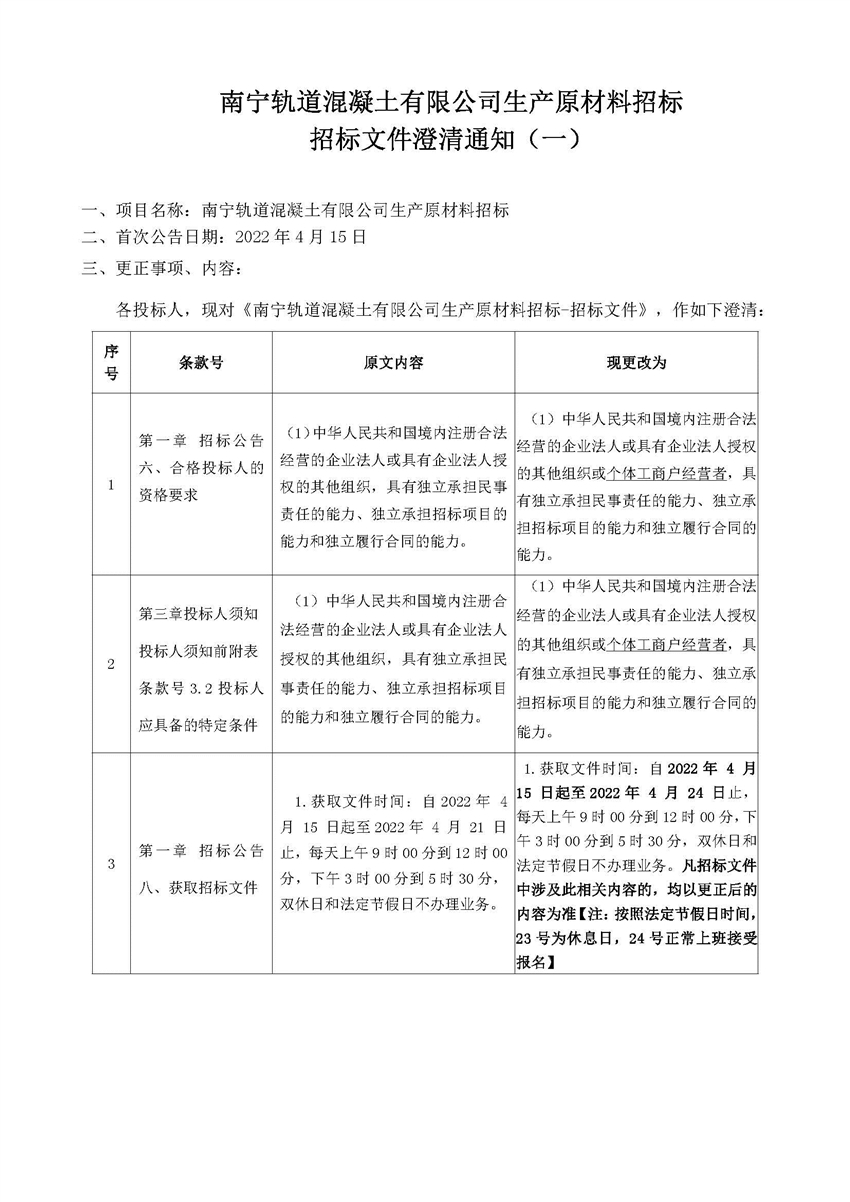 南寧軌道混凝土有限公司生產(chǎn)原材料招標招標文件澄清通知(一)